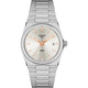 Die Linien des Gehäuses verlängern sich direkt und ohne Einsatz der traditionellen Hörner in das Armband. Dessen auffälligstes Merkmal ist seine Reihe grosser Glieder, die die gesamte Breite beanspruchen. Seine Flexibilität und Geschmeidigkeit machen es zu einem echten Erfolg ergonomischen Designs und vermitteln ein ausserordentliches Tragegefühl. Das Satinieren an den Aussenseiten ist ebenso sorgfältig ausgeführt wie das Polieren der Innenflächen. Die Zeiger der PRX 40 205 sind mit einer SuperLumiNova®-Beschichtung versehen und wurden mit nur sehr geringem Abstand übereinandergesetzt. Dies erlaubt es, das Zifferblatt näher an das Uhrenglas zu bringen. Der von den Tissot-Designern so erzielte optische Effekt lässt das Gehäuse der Uhr noch flacher und schlanker erscheinen, als es tatsächlich ist. Die Tissot PRX Powermatic 80 verfügt über ein kratzfestes, entspiegeltes Saphirglas sowie über einen Sichtboden aus Mineralglas. Diese Ausführung besitzt eine Lünette mit rosegoldfarbener PVD-Beschichtung sowie ein silberfarbenes Zifferblatt mit Indizes und ein 316L-Edelstahlarmband mit Butterfly-Faltschliesse mit Drückern.